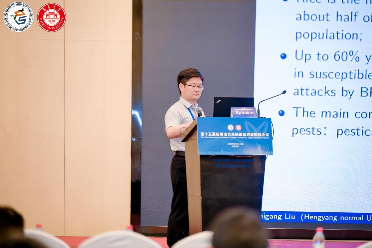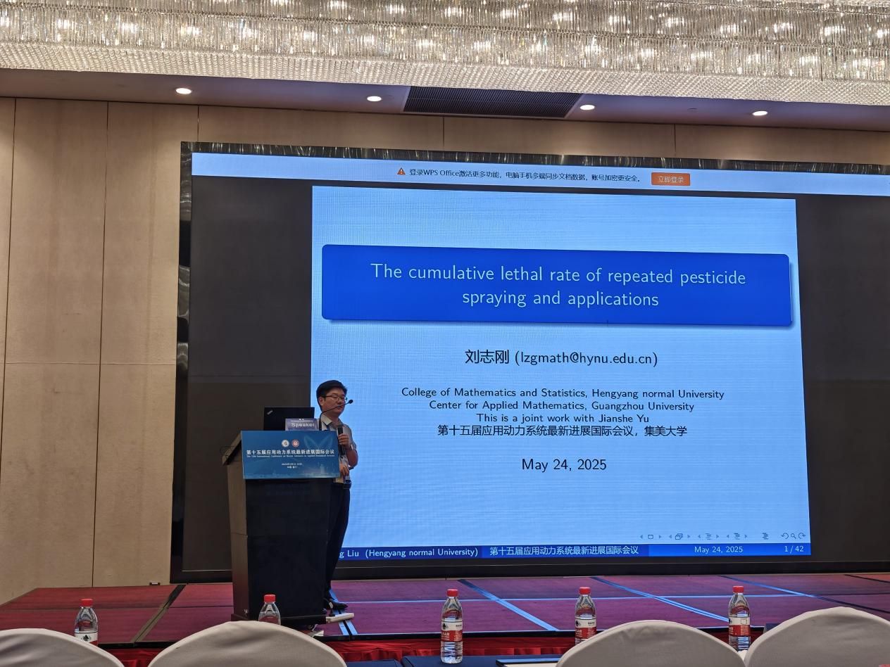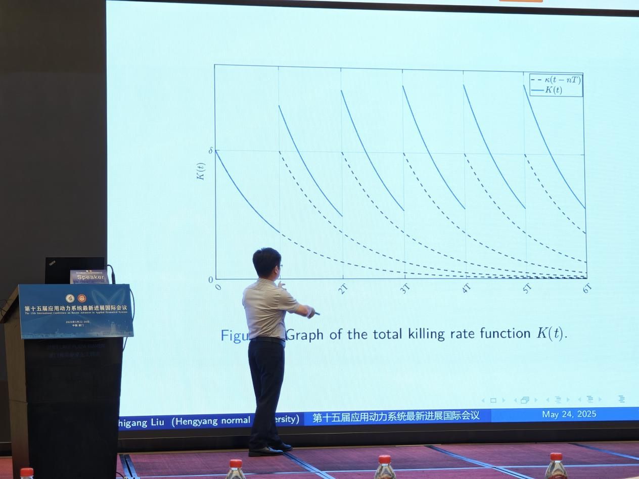 公司刘志刚博士参加了本次会议,并做了题为《The cumulative lethal rate of repeated pesticide spraying and applications》的学术报告。由于农药残留作用,反复施用农药会对害虫具有累积致死效应。然而这一概念目前在生物数学几乎所有害虫防控模型中均未得到足够关注。他在报告中首次提出了“The cumulative lethal rate”,对它在数学上进行了刻画,并给出了累积致死率函数在一个喷施周期内的积分不变量,利用这个不变量得到一类害虫防治模型的完整动力学分析,包括周期解的存在性、唯一性和稳定性,进而获得了害虫种群最终灭绝的农药喷施周期阈值。这一最新研究成果引起了与会者的浓厚兴趣,不少学者与刘志刚博士进行了深入的交流。