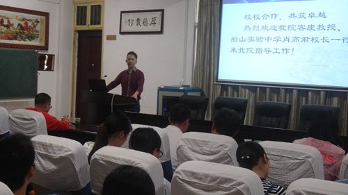 5月24日下午,船山实验中学肖高君董事长一行5人莅临公司参加以“校校合作,共筑卓越”为主题的卓越教师指导经验交流会。会议在数学楼三楼会议室召开,教务处罗文处长、公司领导,14级数学与应用数学专业卓越班指导老师和全体学员参加了本次会议。