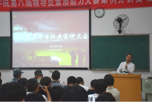 身怀报国志,建功正当时。携笔从戎去,争做好男儿。5月16日晚,公司2019年老员工征兵宣讲大会在外语楼北301成功举办。此次大会邀请了南岳公司曹廷、文公司俞晨超、音乐公司唐涛及公司的凌晓妍和王素分等5名退役在校老员工,和有强烈入伍意向的2018级信息与计算科学专业何振强同学为宣讲嘉宾。公司辅导员兼武装专干周长恩老师出席并作发言,公司全体男生积极参加。